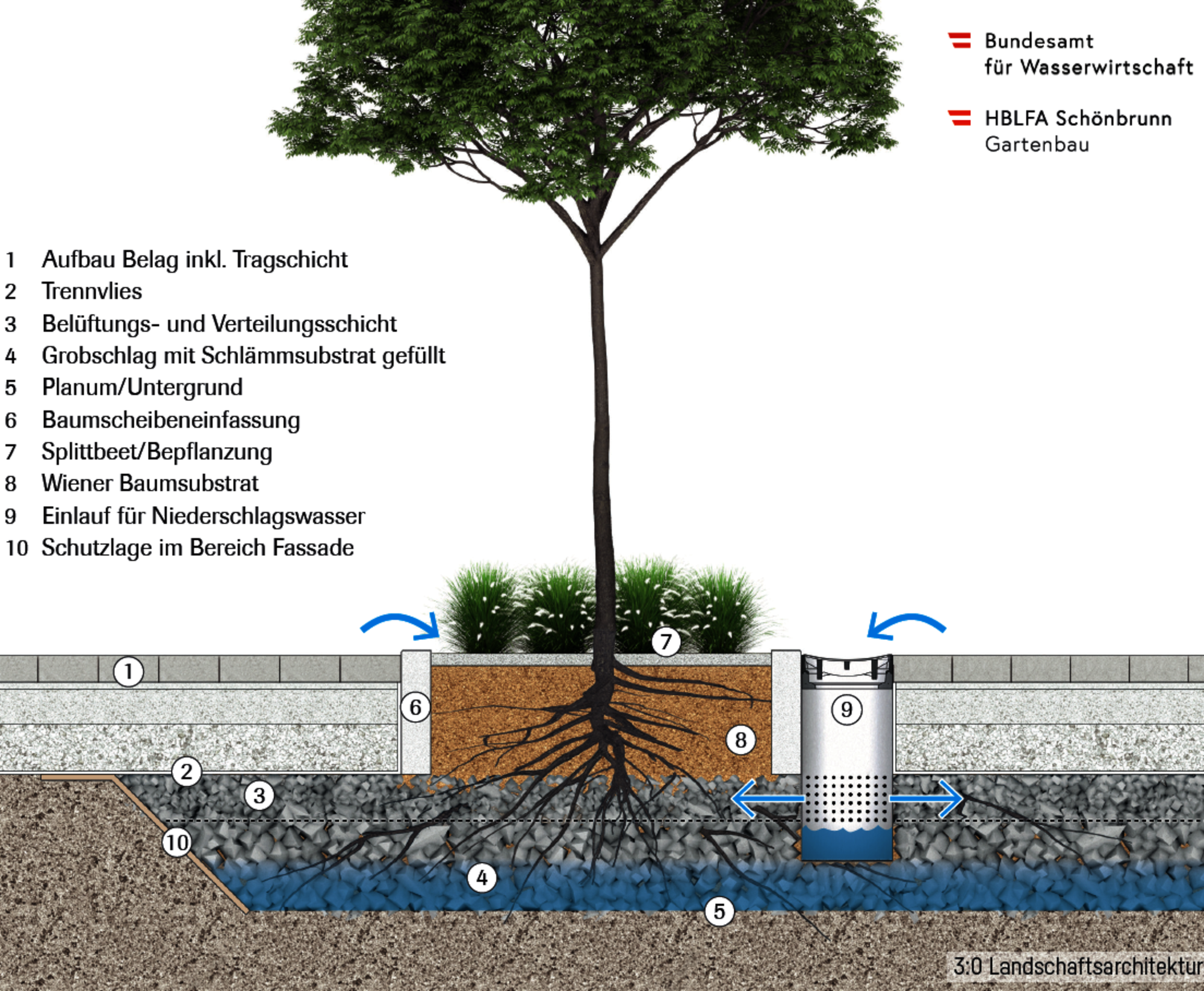 Entwickelt wurde das Schwammstadt-Prinzip in Skandinavien. Stockholm und viele andere Städte und Gemeinden setzen es bereits seit Jahrzehnten erfolgreich ein. Stefan Schmidt von der HBLFA Schönbrunn hat das Konzept nach Österreich gebracht und forscht federführend dazu. Im „Arbeitskreis Schwammstadt“ unter der Schirmherrschaft der Österreichischen Gesellschaft für Landschaftsarchitektur (ÖGLA) treibt er mit Kolleginnen und Kollegen aus Praxis und Verwaltung das Prinzip in Österreichs Städten voran. Denn noch ist weitere Forschung und Entwicklung nötig, damit das skandinavische Prinzip für die österreichischen Gegebenheiten langfristig gut adaptiert werden kann. Pilotprojekte und erste Umsetzungen in Österreichs Städten dazu laufen. (AS, Juni 2020)