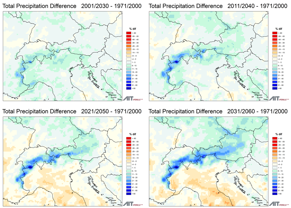 Die Szenarien zeigen, bezogen auf Österreich, beim Niederschlag regional eine breitere Streuung. Dabei ist festzuhalten, dass bei der Veränderung des Niederschlags ein Unsicherheitsbereich von +/- 10% zu berücksichtigen ist, d.h. nur das Über- bzw. Unterschreiten dieser 10% Grenze wird als deutliche Änderung beurteilt. Liegen die relativen Veränderungen zwischen +/- 10%, dann kann von einer weitgehend stabil bleibenden Situation gesprochen werden. Abweichungen, die darüber hinaus gehen, zeigen Niederschlagszunahmen im Winter und Niederschlagsabnahmen im Sommer, die sich soweit ausgleichen, dass die Jahressummen weitgehend konstant bleiben.