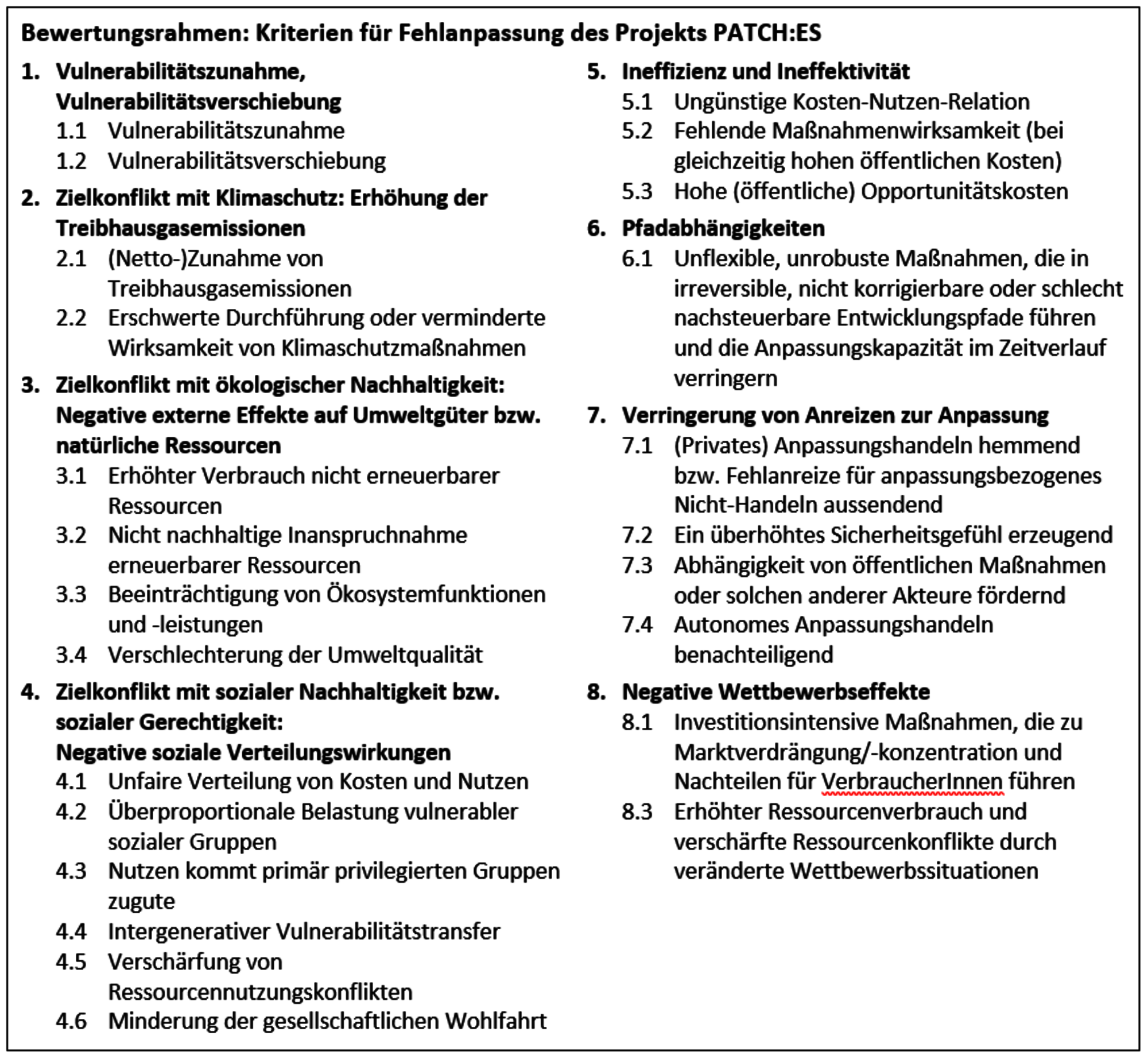Das Thema möglicher Fehlanpassung erfährt derzeit – u.a. im Zuge zunehmender Mittelbereitstellung für die internationale Klimafinanzierung – erhöhte Aufmerksamkeit, weil Regierungen, Verwaltung und finanzierende Institutionen ein starkes Interesse daran haben, nur solche Maßnahmen zu finanzieren, die wirksam, kosteneffizient und nachhaltig sind. Fehlanpassung bezeichnet im Gegensatz dazu „Lösungen, die schlechter sind als das ursprüngliche Problem“. PATCH:ES befasste sich mit Risiken von Fehlanpassung im Kontext von privater Anpassung, da private Maßnahmen überwiegend autonom und reaktiv, also ungeplant oder nicht im Bewusstsein des Klimawandels erfolgen sowie in der Regel durch starke Eigeninteressen motiviert sind. So sind für Private z.B. der Schutz eigener materieller und immaterieller Werte oder die Erlangung von Wettbewerbsvorteilen und einer verbesserten Marktposition von besonderer Bedeutung. Private Eigeninteressen können aber auch in einem Spannungsverhältnis zu gesamtgesellschaftlichen Zielen stehen. Dies kann zu maladaptiven Wirkungen von Anpassungsmaßnahmen führen, wie negativen externen Effekten auf Gemeingüter, einer Verschärfung des Klimawandels und Konflikten mit (anderen) öffentlichen Interessen. Daher wurde auf Basis einer aktuellen Literaturrecherche ein systematischer Katalog von Fehlanpassungskriterien erarbeitet, in die Untersuchungsmethoden der Fallstudien integriert und auf die Analyse der Fallstudienergebnisse angewendet. In allen Fallstudien wurden in unterschiedlichem Ausmaß maladaptive Symptome und Hinweise auf Fehlanpassung festgestellt. Auch Nicht-Handeln kann in bestimmten Fällen als Fehlanpassung gelten. In der Fallstudie zum Hochwasserschutz von Privathaushalten wurden beispielsweise folgende Hinweise für Fehlanpassungsrisiken identifiziert, die aus der Verringerung von Anreizen für privates Anpassungshandeln resultieren: