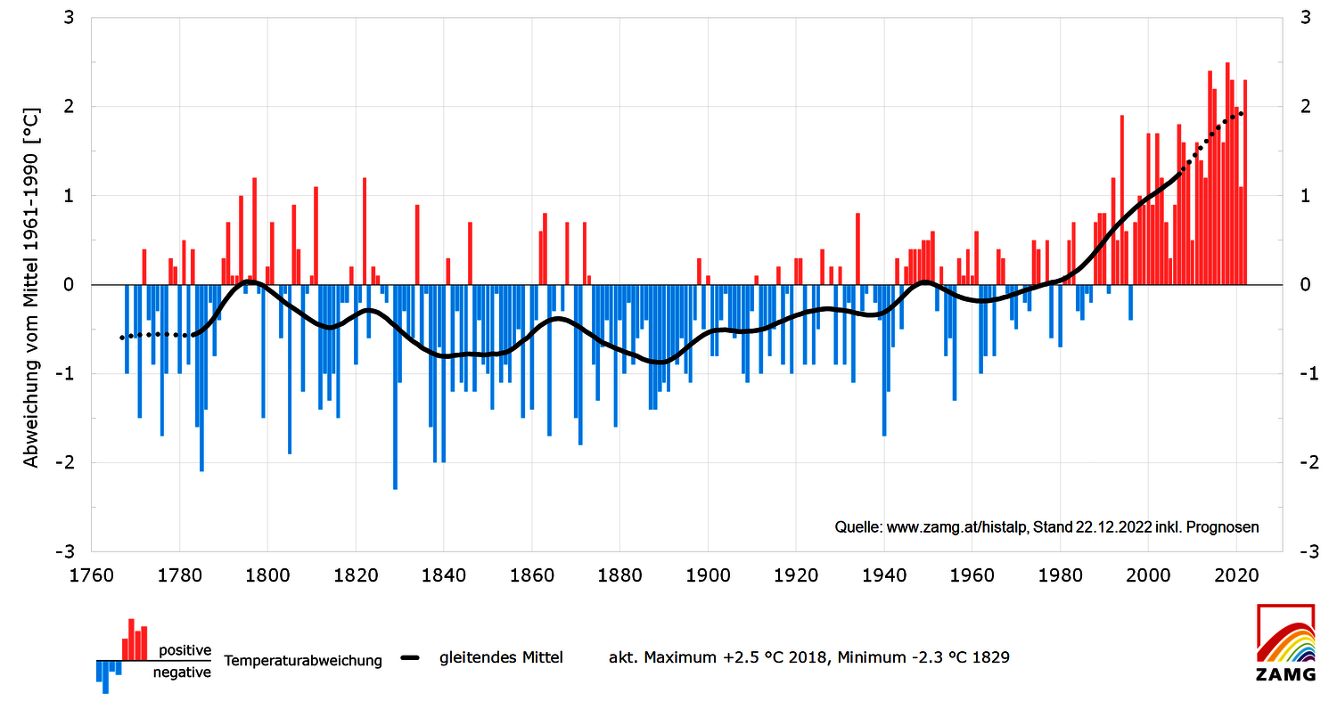 Nicht nur das Ranking einzelner Extremjahre sondern die neuerliche Bestätigung des langfristigen Trends zur globalen Erderwärmung ist von Bedeutung und zeigt wiederholt den enormen Handlungsbedarf auf. Im Vergleich zum langjährigen Mittel von 1991 bis 2020 verliefen in Österreich acht der letzten neun Jahre – mit Ausnahme des Jahres 2021 – überdurchschnittlich warm. Insbesondere der Februar und der Oktober stechen durch eine mittlere Abweichung von mehr als plus 3 °C im Vergleich zu den Durchschnittswerten der Klimanormalperiode von 1991 bis 2020 hervor.