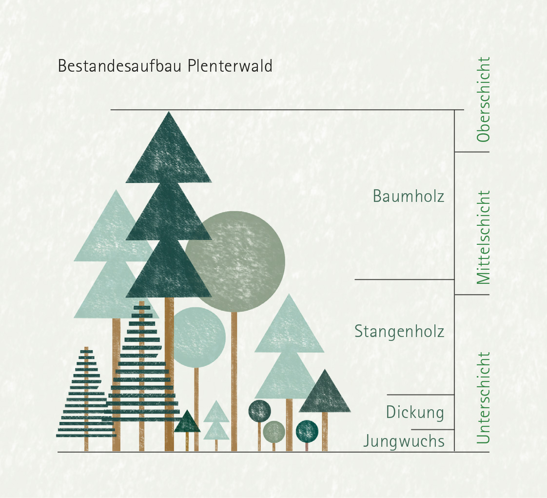 Unsere Wälder leiden unter Trockenheit und hohem Schädlingsdruck. Fichten-Monokulturen werden von Stürmen und starkem Borkenkäferbefall dahingerafft, große Lücken tun sich in den betroffenen Wäldern auf. Ein Modell für eine alternative Bewirtschaftungsweise ist der Plenterwald: Seine naturnahen Bestände sind stabil und weniger anfällig für Schäden. Damit ist er fitter gegen klimawandelbedingte Veränderungen.